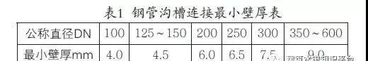 由于溝槽管件與管道外壁接合,因此,管道外徑偏差過量將使管道與卡箍不匹配,會造成接頭滲水。此外,管材材質不合格,鍍鋅層不牢固,管壁厚度不足,都將會在壓槽時可能造成管子斷裂、鍍鋅層大量脫落或高頻焊縫開裂,最終導致接頭滲水或斷裂。因此,嚴格控制管材質量至關重要。各類管材均應符合相應的國家標準,如鍍鋅焊接鋼管應符合《低壓流體輸送用鍍鋅焊接鋼管》(GB/T3091)的規定,無縫鋼管應符合《輸送流體用無縫鋼管》(GB/T8163)的規定,涂塑鍍鋅焊接鋼管和涂塑無縫鋼管應符合《給水涂塑復合鋼管》(CJ/T的規定等。此外,鋼管壁厚還應滿足最小壁厚要求。(見表1)