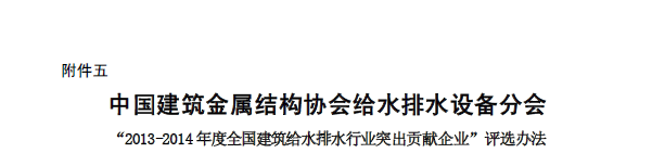 1、為了表彰我國建筑給水排水企業在執行國家節能、環保和可持續發展的大政方針以及科技創新、技術進步、科學管理、產品研發、增強自主創新能力等方面所取得的突出成就,熱心行業事業和公益事業,給水排水設備分會決定在建筑給水排水行業中開展“2013-2014年度全國建筑給水排水行業突出貢獻企業”的評選表彰工作,對獲選的企業授予“全國建筑給水排水行業突出貢獻企業”稱號。