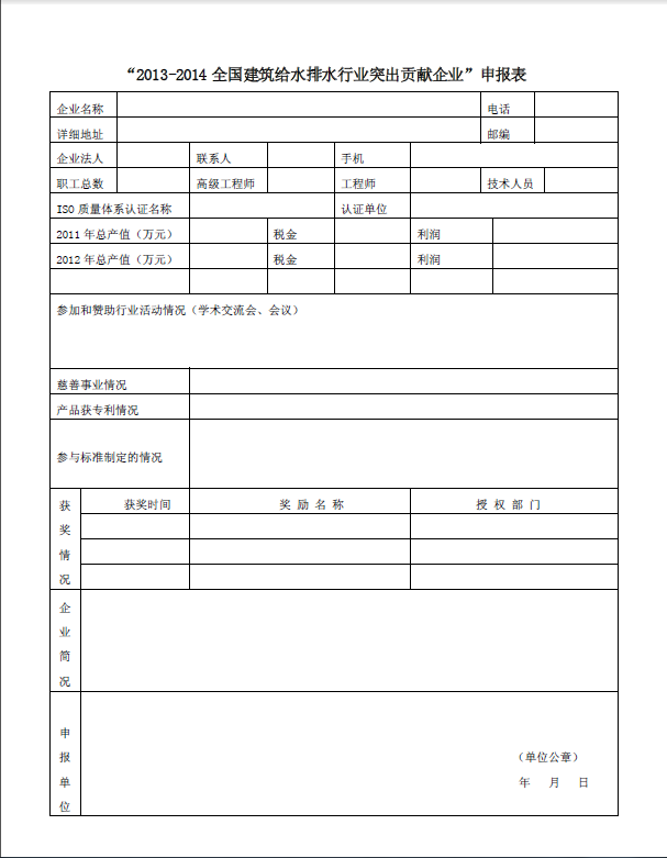 企業可向各所在專業委員會提出申請,索取或在分會官方網站《中國建筑水網》(http://www.ccbw.com.cn)上下載“突出貢獻企業”申報表格(附件一),按規定填寫(一試兩份)并附以下材料一并報送: