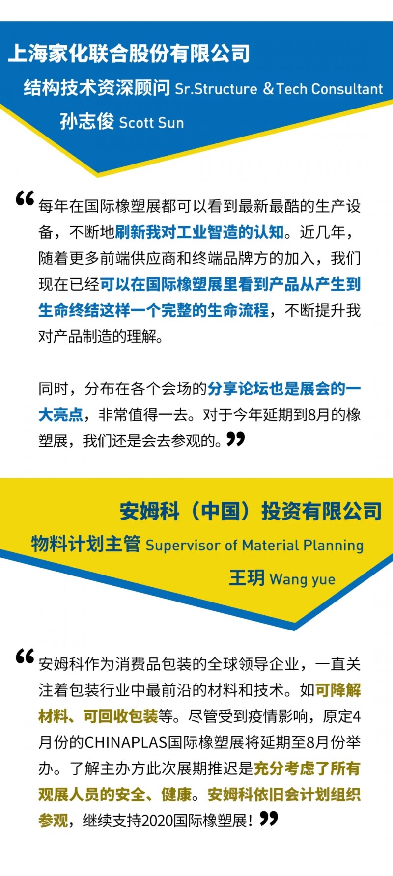 “CHINAPLAS 2020 國際橡塑展”將延期至2020年8月3 - 6日,在上海·虹橋·國家會展中心舉行,高效對接下游高端買家高精準的需求,為業(yè)界帶來高水準、高規(guī)格的橡塑盛宴。