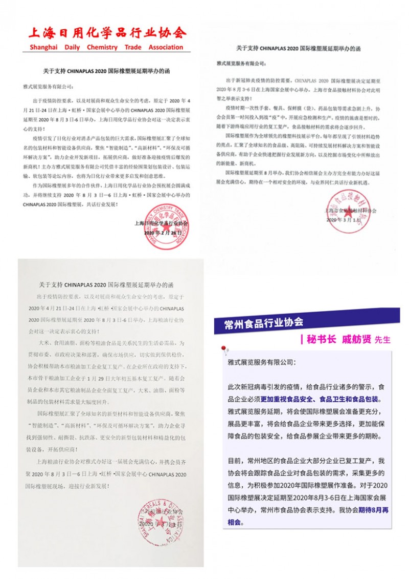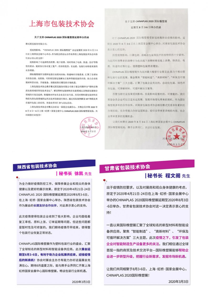 包裝行業(yè)協(xié)會也都紛紛來函表示對延期的2020國際橡塑展充滿信心及期待!