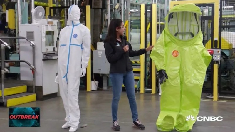 杜邦防護(hù)服的生產(chǎn)流程開始于美國弗吉尼亞州的里士滿,杜邦公司最大的工廠坐落于此,聚乙烯織物經(jīng)過加熱和加壓處理后會被攤平卷起,然后被運(yùn)送到全球各地的9個生產(chǎn)工廠制作成防護(hù)裝備。